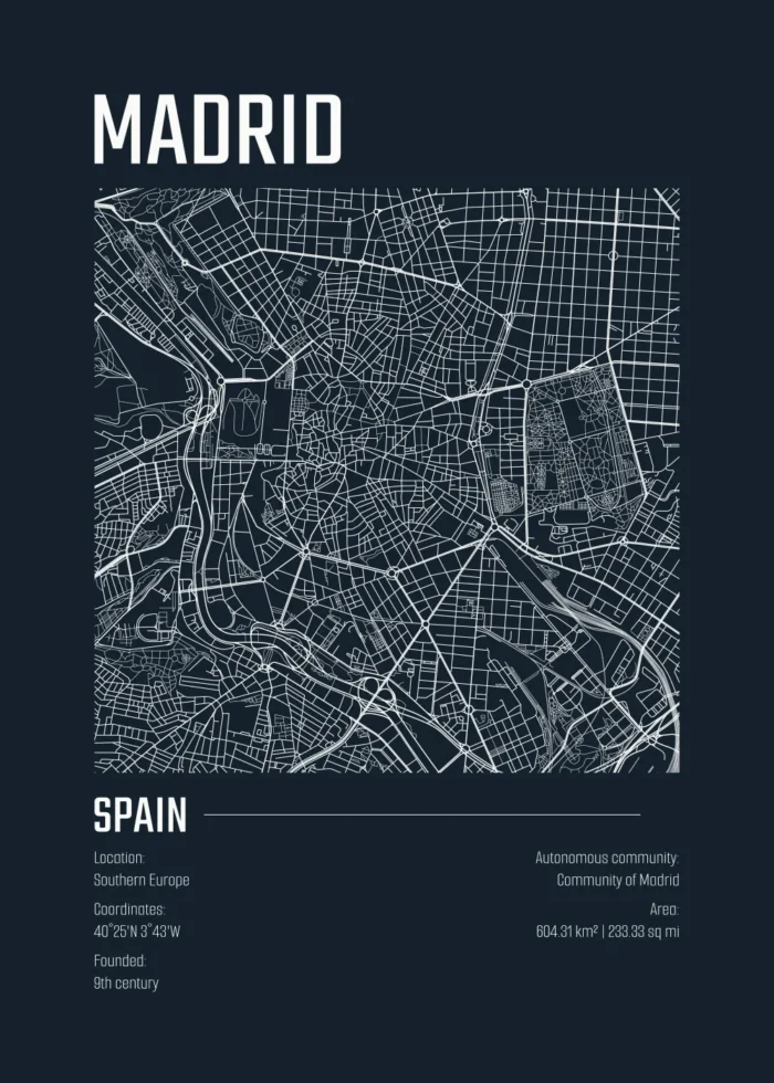 Постерът „Мадрид“ показва детайлна карта на испанската столица в стилна черно-бяла визия – съчетание от геометрия, баланс и градски дух.