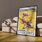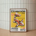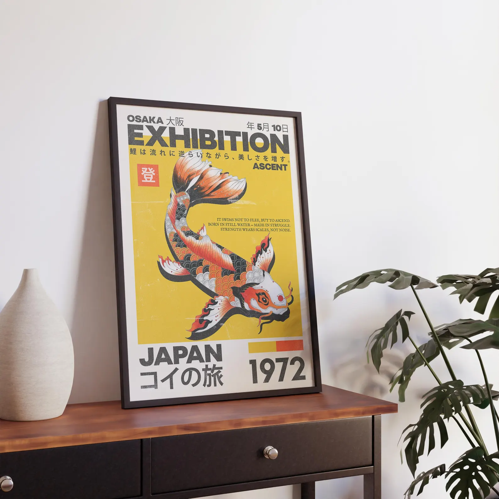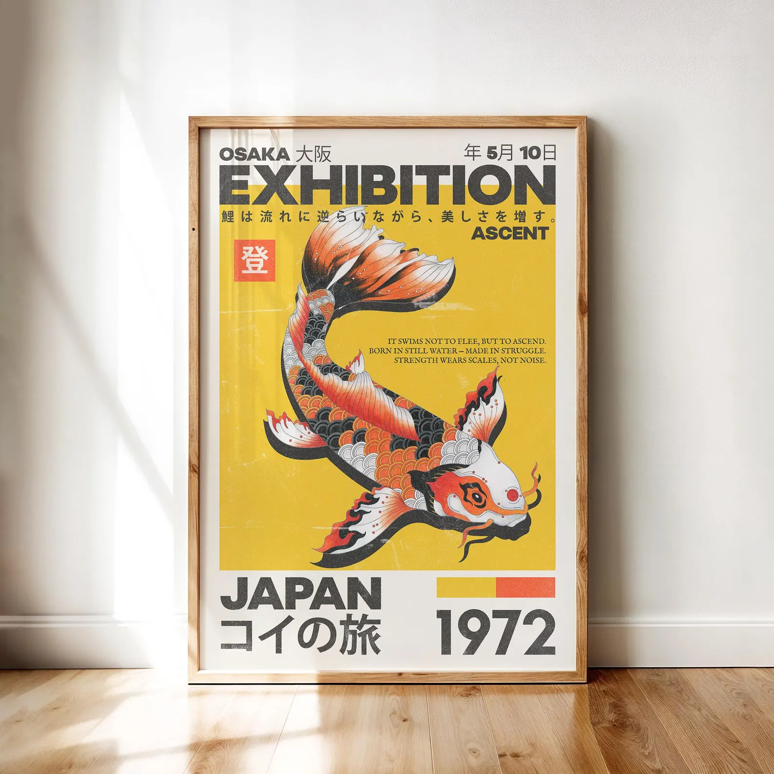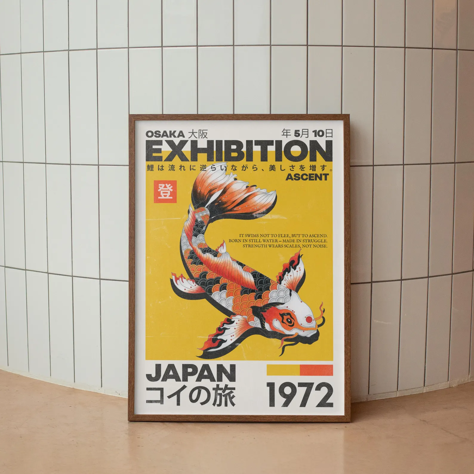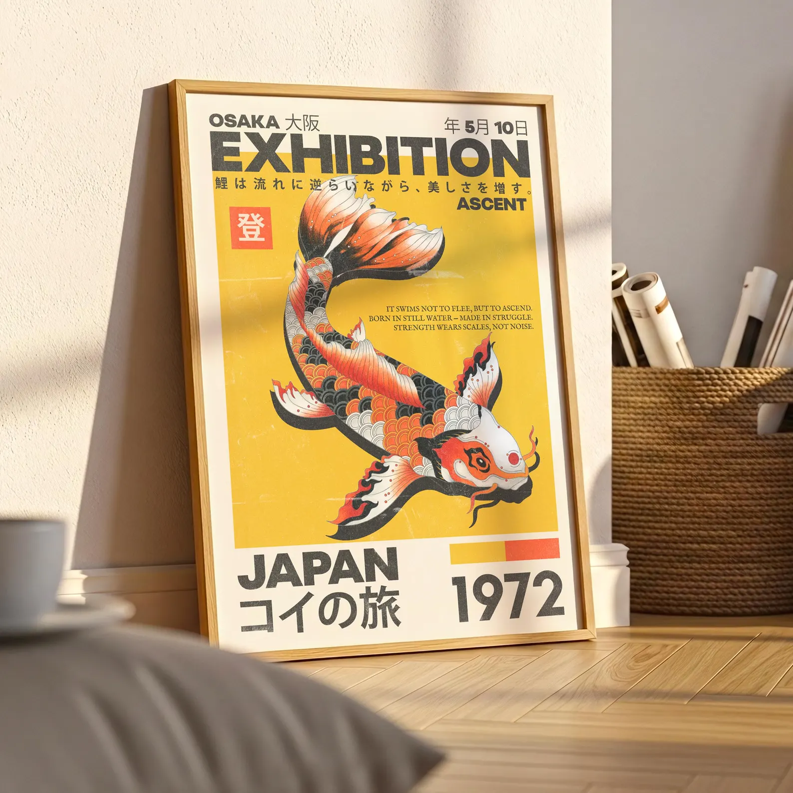 Арт постер с висококачествен принт върху хартия, вдъхновен от японската култура и символиката на шарана кои – символ на сила, упоритост и успех. Дизайнът наподобява ретро изложбен плакат от 1972 г. с надпис „EXHIBITION – ASCENT“ и японски текстове.