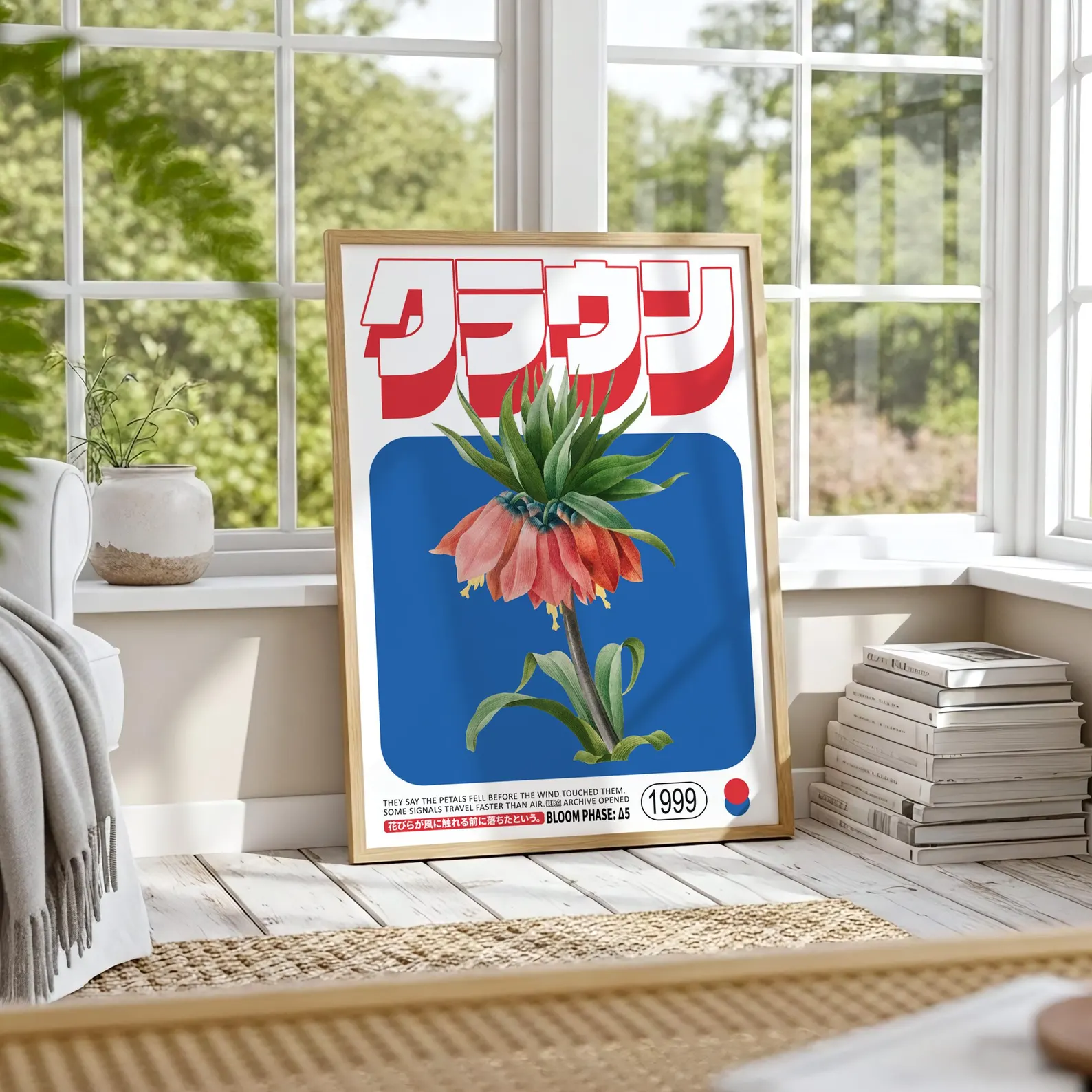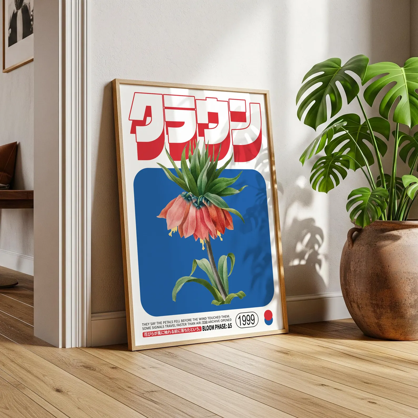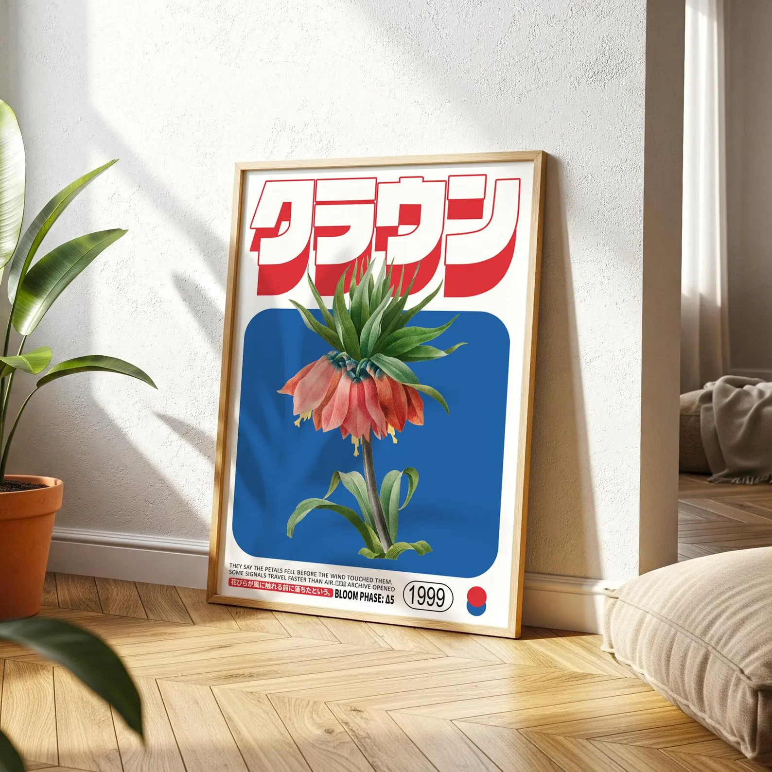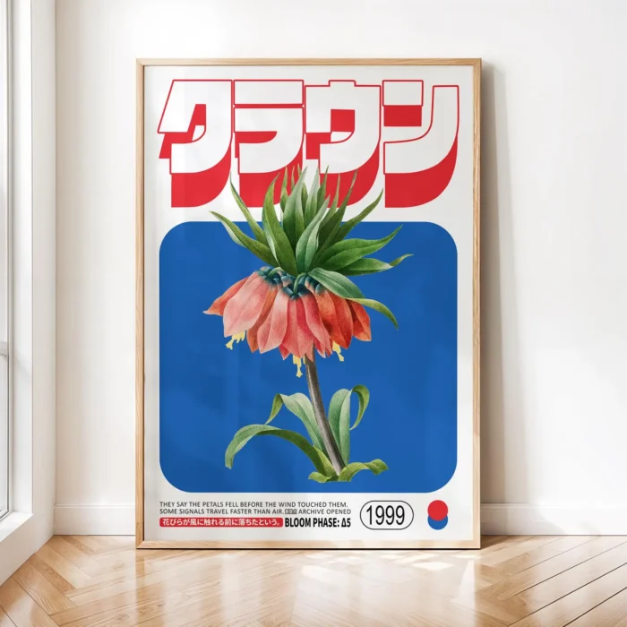 Арт постер с висококачествен печат върху хартия, изобразяващ екзотично червено цвете в комбинация с модерен графичен дизайн и японски надписи. Съчетава минимализъм и ретро естетика, което го прави чудесен акцент за дом, офис или заведение.