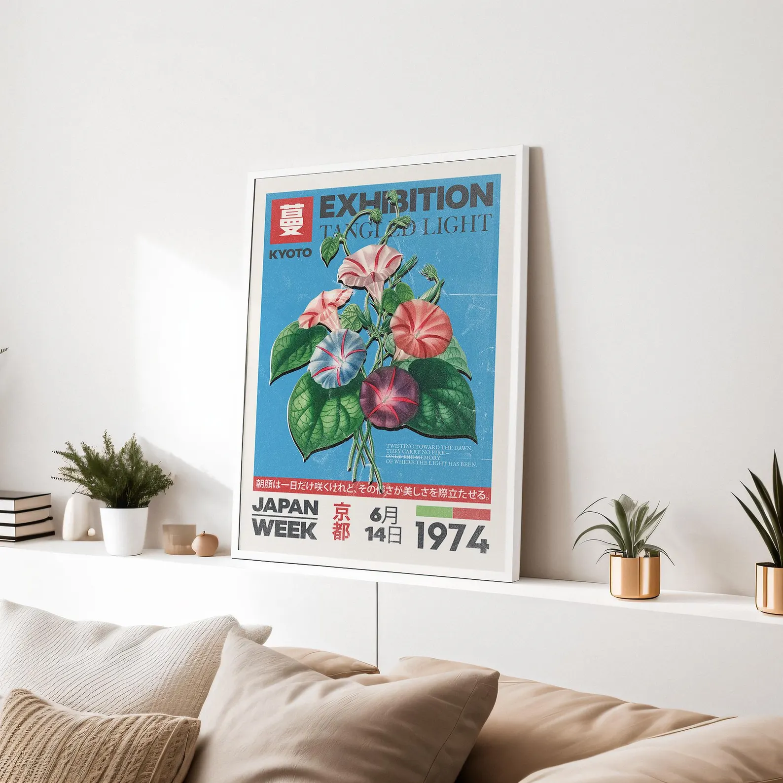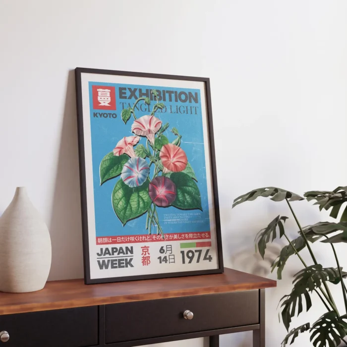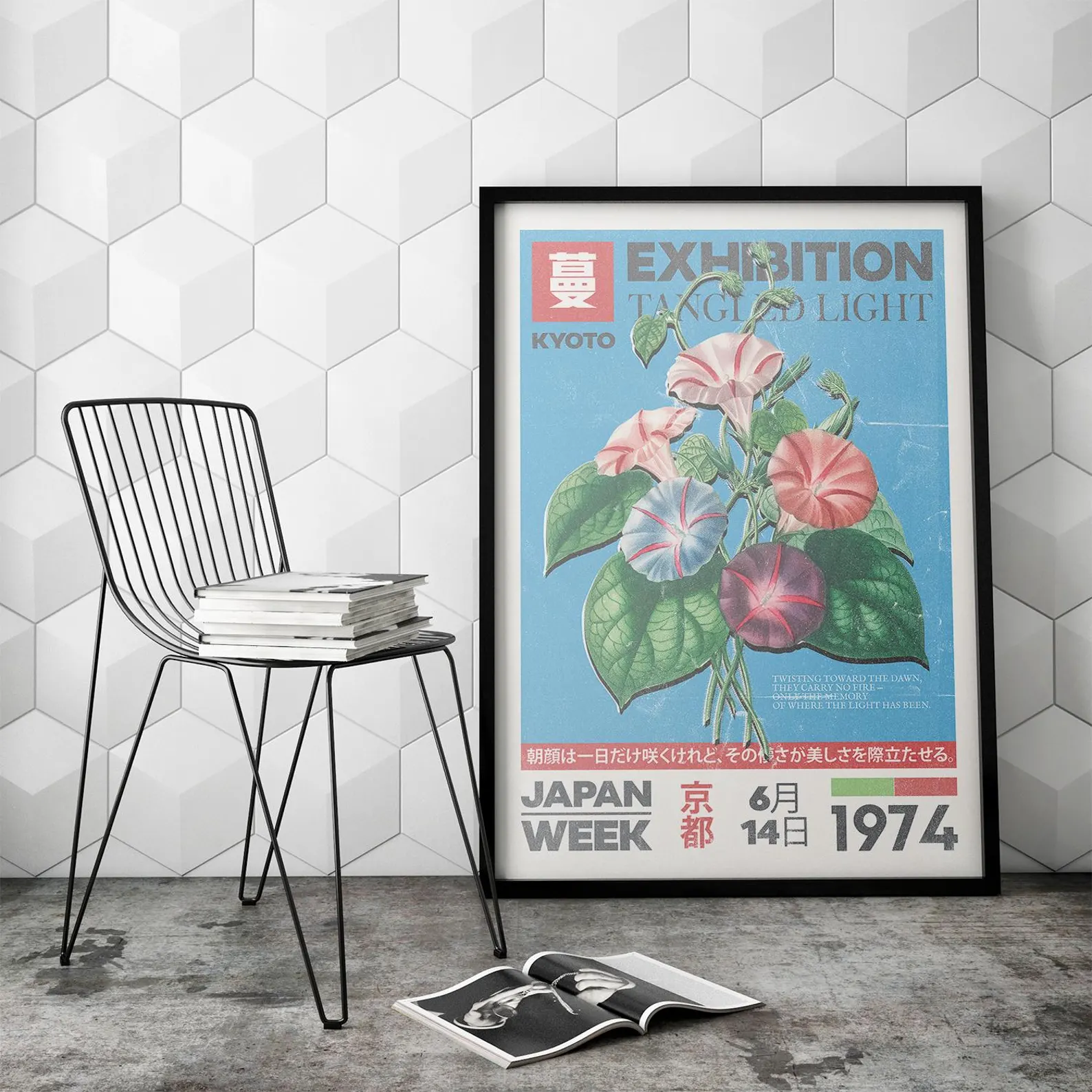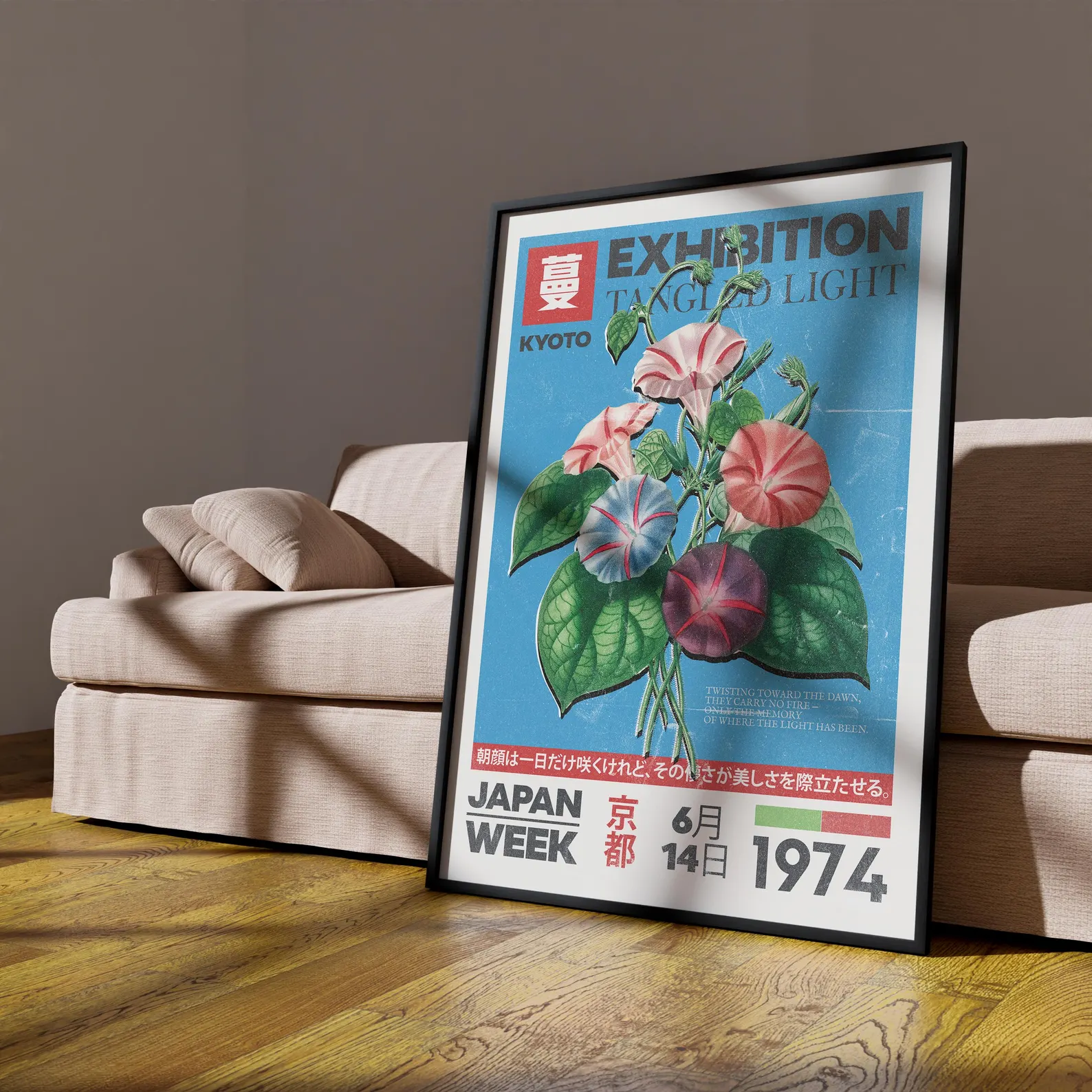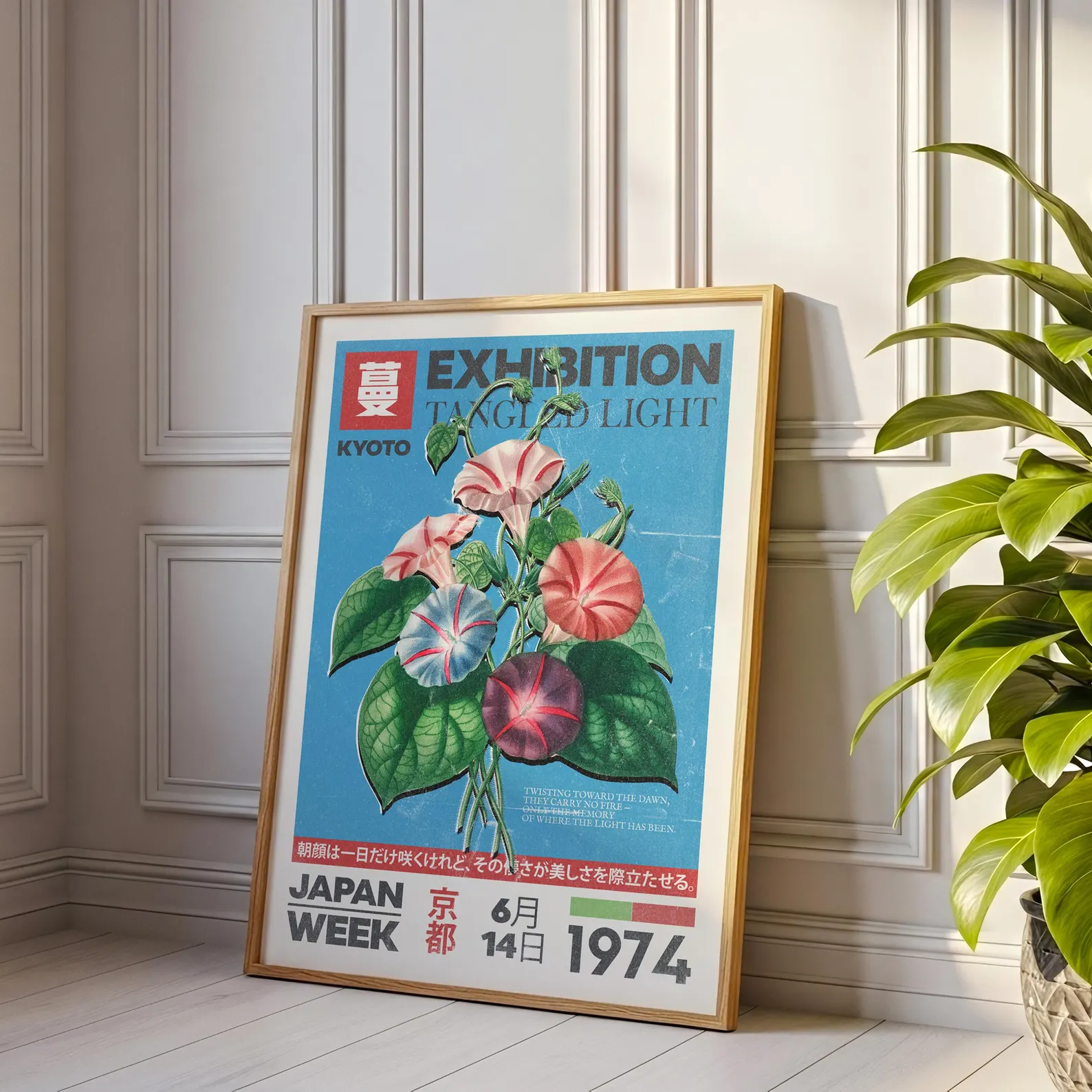 Арт постер с висококачествен принт върху хартия, вдъхновен от японските ретро изложбени плакати от 70-те години. Дизайнът представя цветя върху син фон, придружени от надписите „EXHIBITION – TANGLED LIGHT“ и „JAPAN WEEK – KYOTO, 14 юни 1974“.