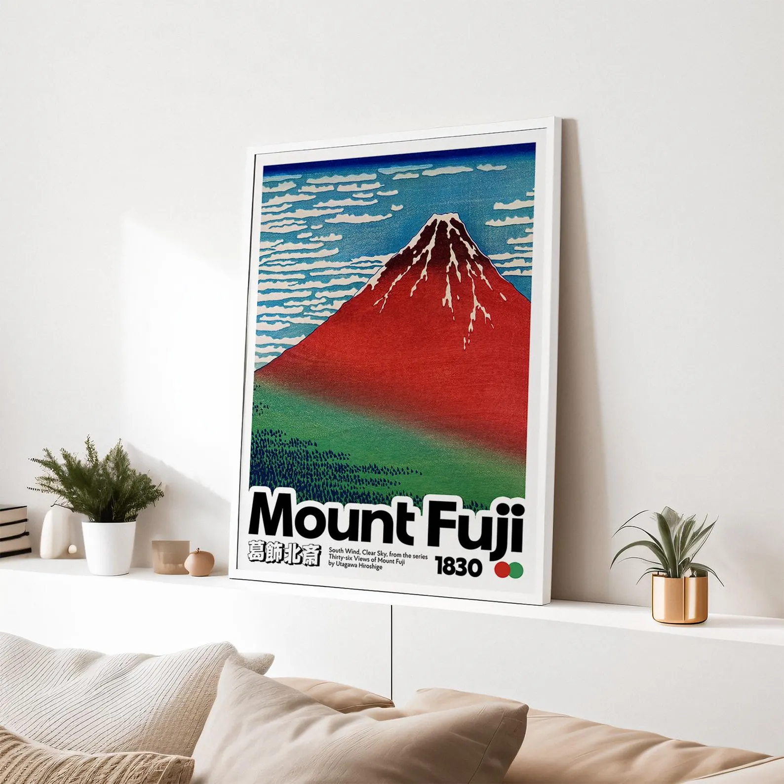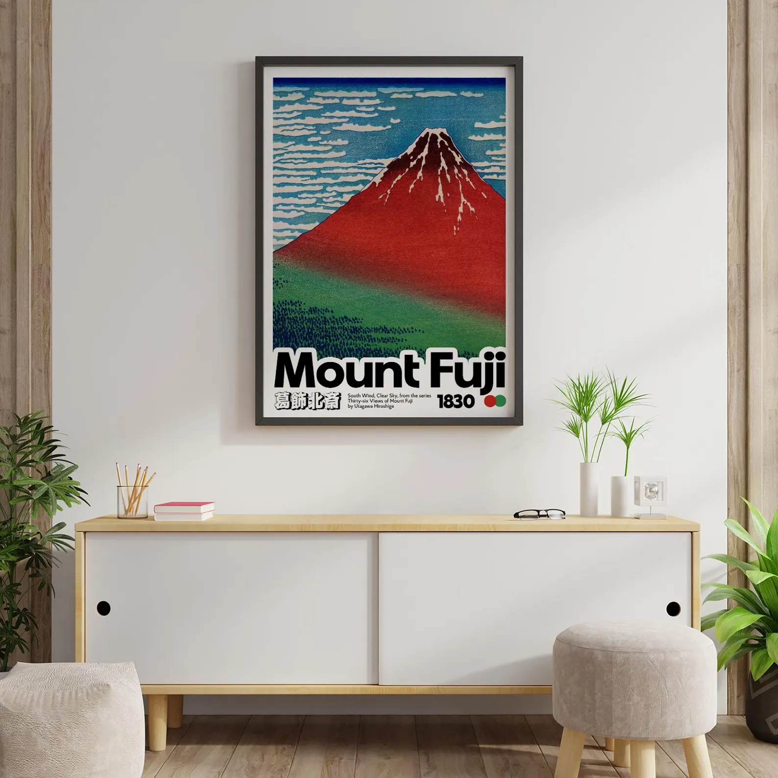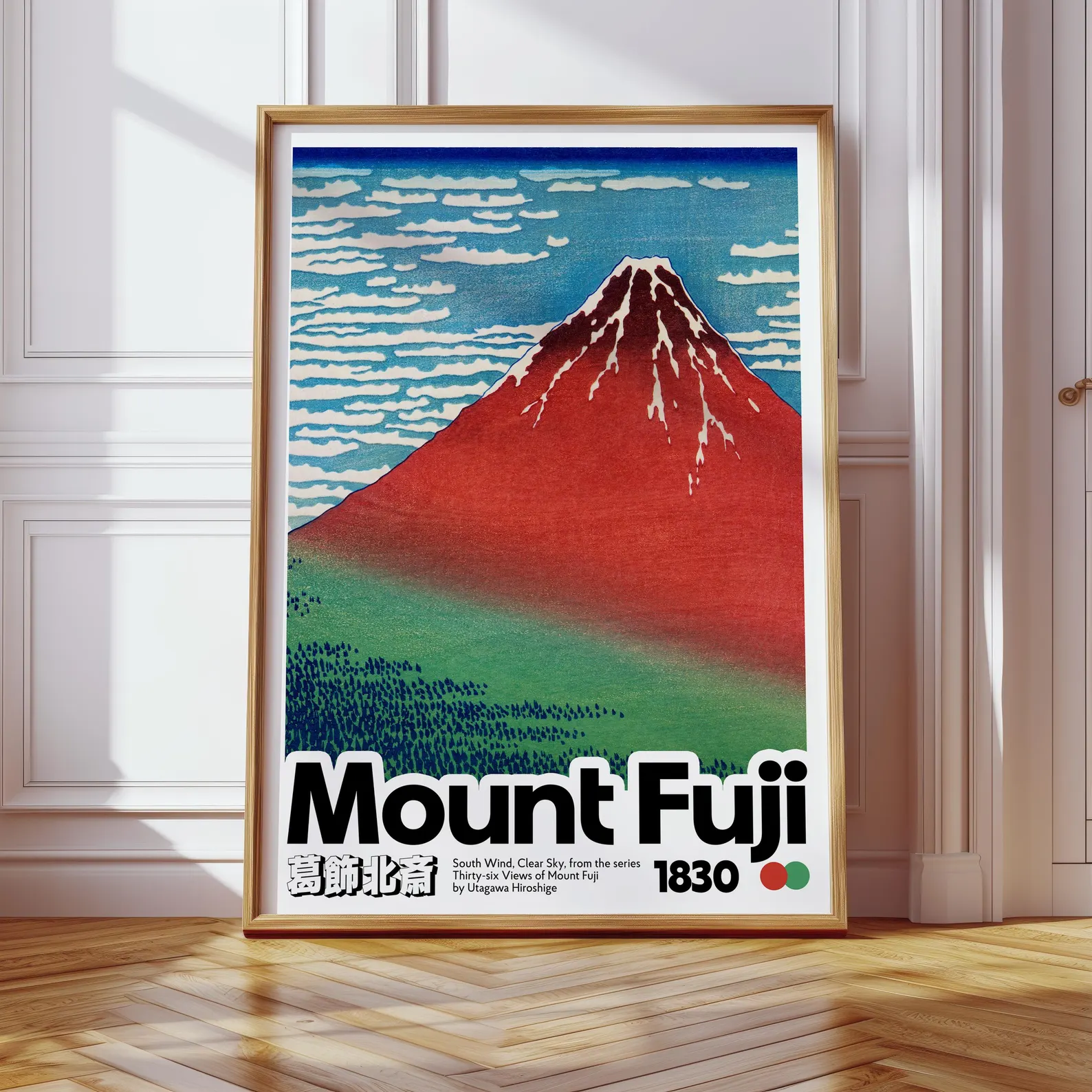 Арт постер с висококачествен принт върху хартия, представящ класическата гравюра „South Wind, Clear Sky“ (известна и като „Червената Фуджи“) от серията „36 изгледа към планината Фуджи“. Произведението е създадено през 1830 г. от японския художник Кацушика Хокусай и е едно от най-емблематичните изображения на свещената планина.