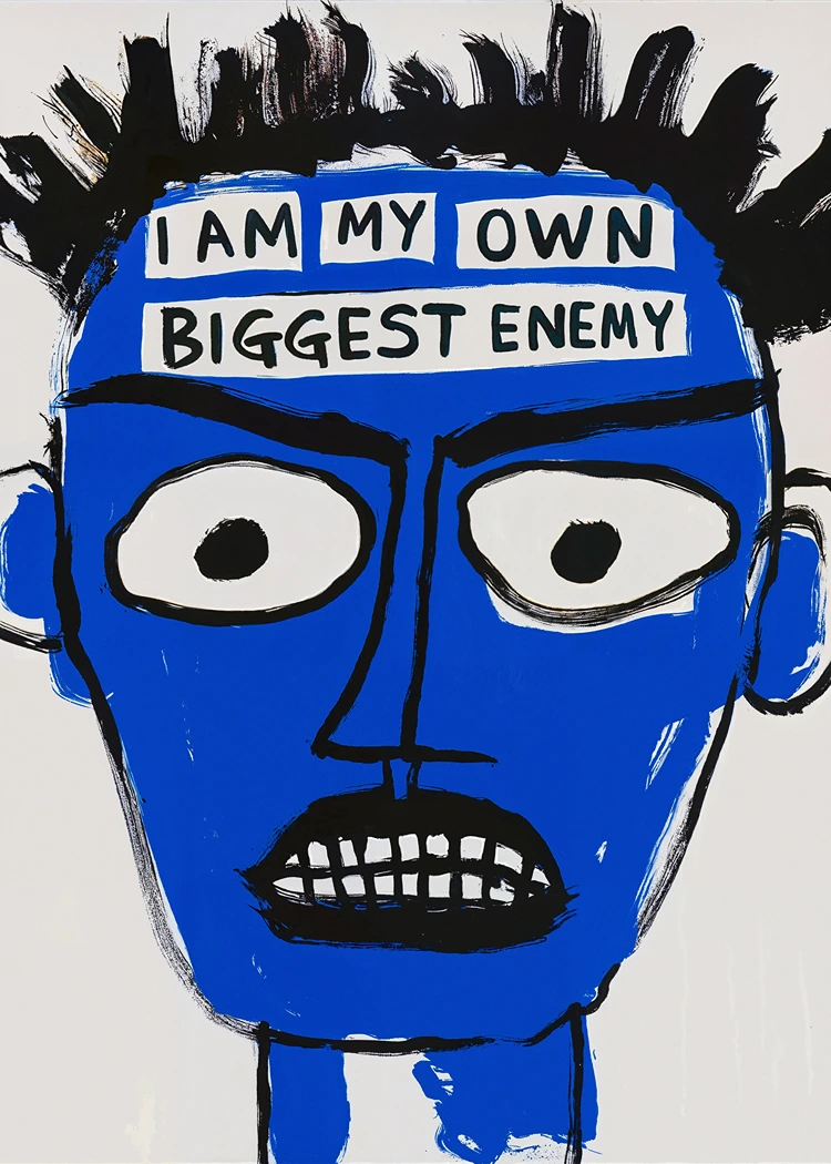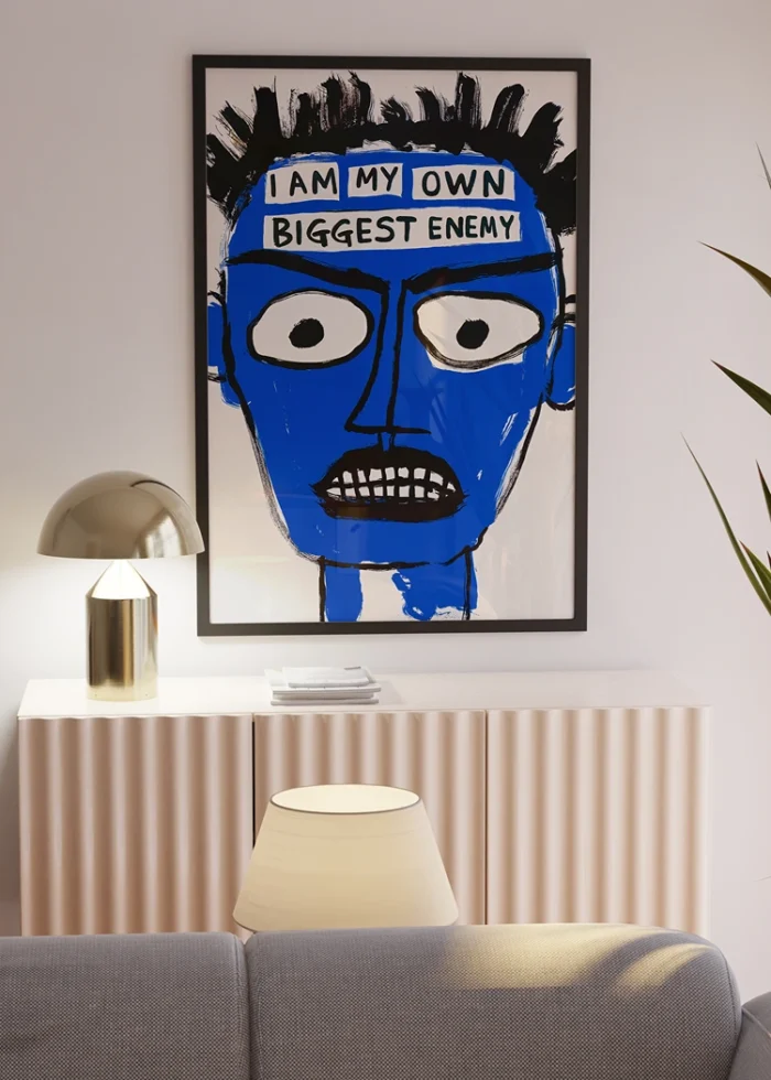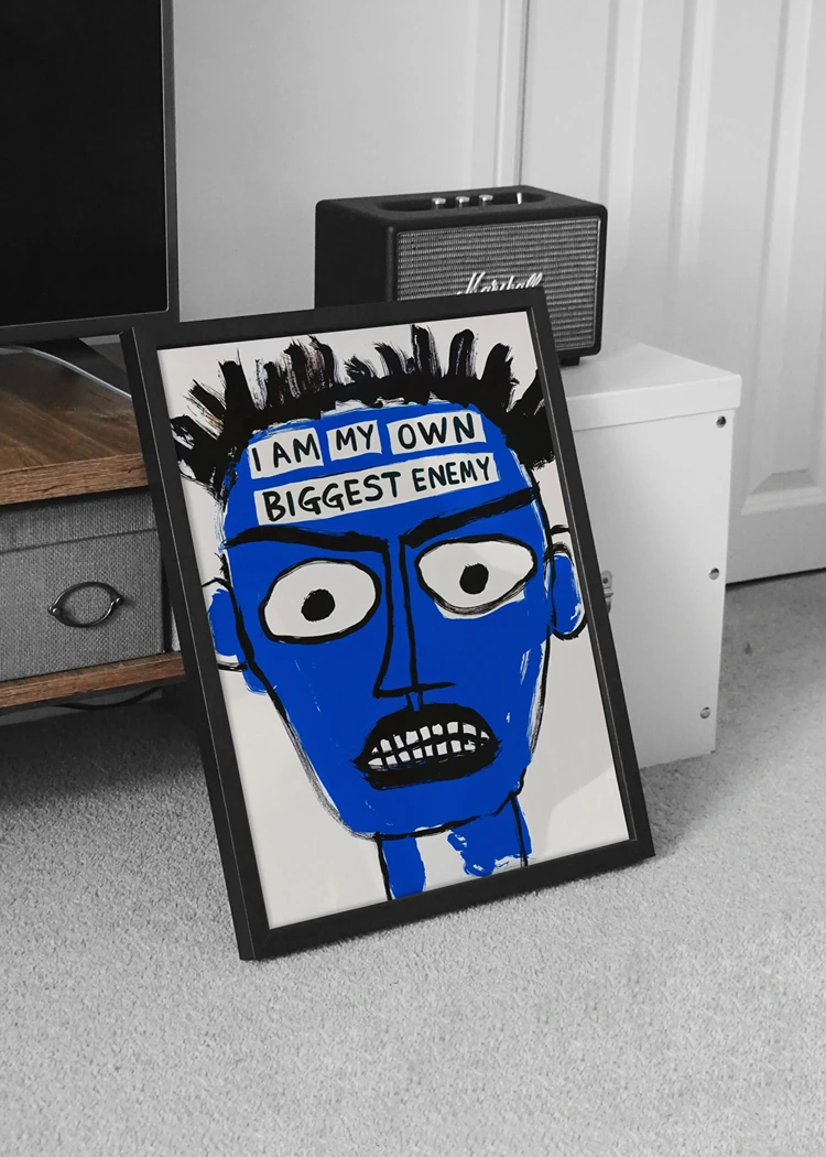 Истинското изкуство не е само за красота, то е за истина. Нашият арт постер Biggest Enemy е създаден за тези, които ценят дълбоките послания и не се страхуват от саморефлексията. Изображението представя синьо лице в суров, неоекспресионистичен стил, допълнено от текста „I am my own biggest enemy“. Това е визуален прочит на вътрешния конфликт, поднесен с енергията на стрийт арт културата.