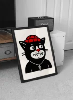 Защо да изберете този дизайн? Дизайнът на арт постер Black Cat е създаден за тези, които ценят градската култура, алтернативното изкуство и, разбира се, котките с индивидуалност. Контрастът между черното тяло на котката, бялото лице и яркочервения акцент на шапката създава силна визуална динамика. Той е идеален избор за хол, тийнейджърска стая, студио или офис, където искате да разчупите атмосферата с доза хумор.