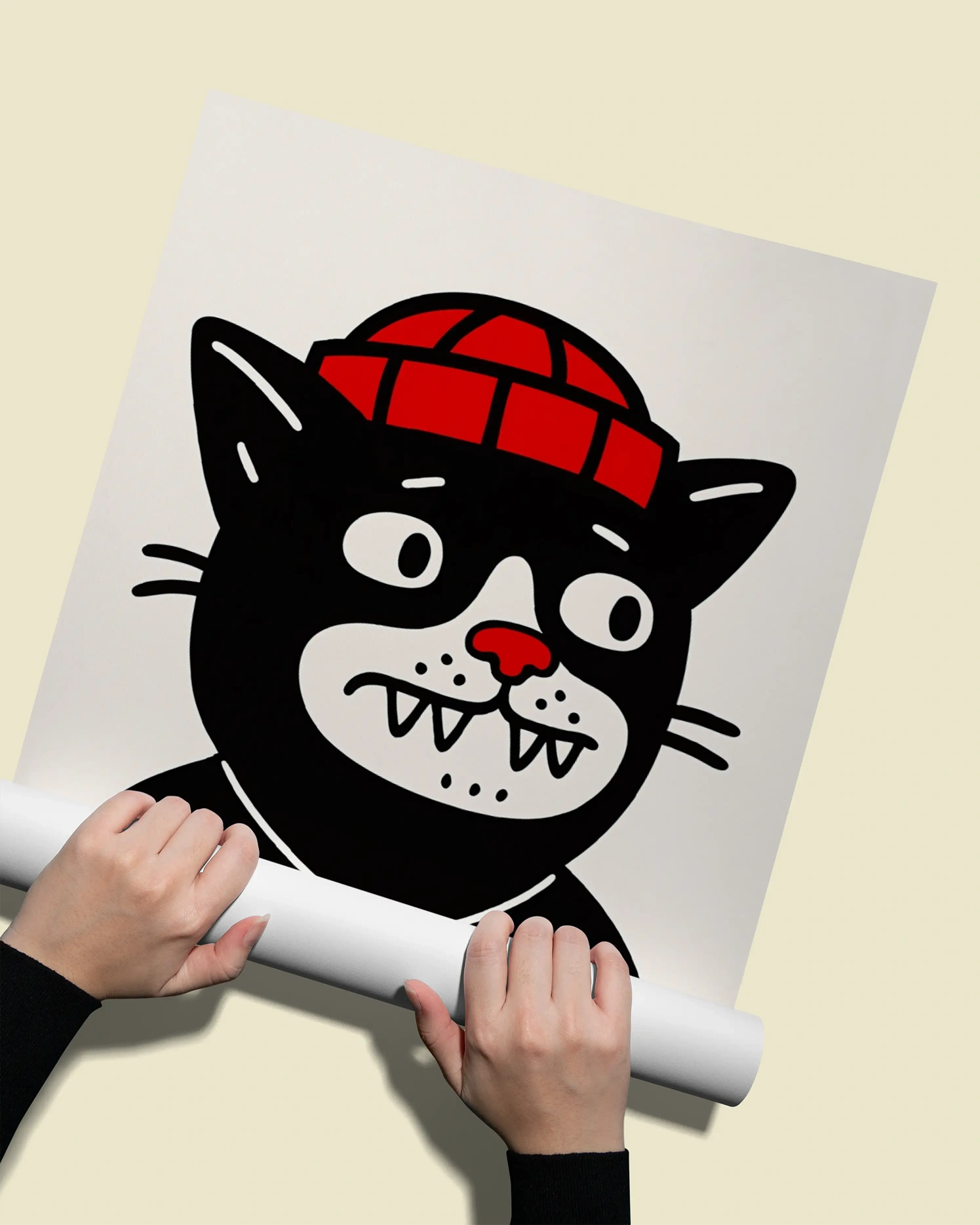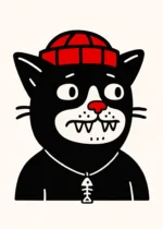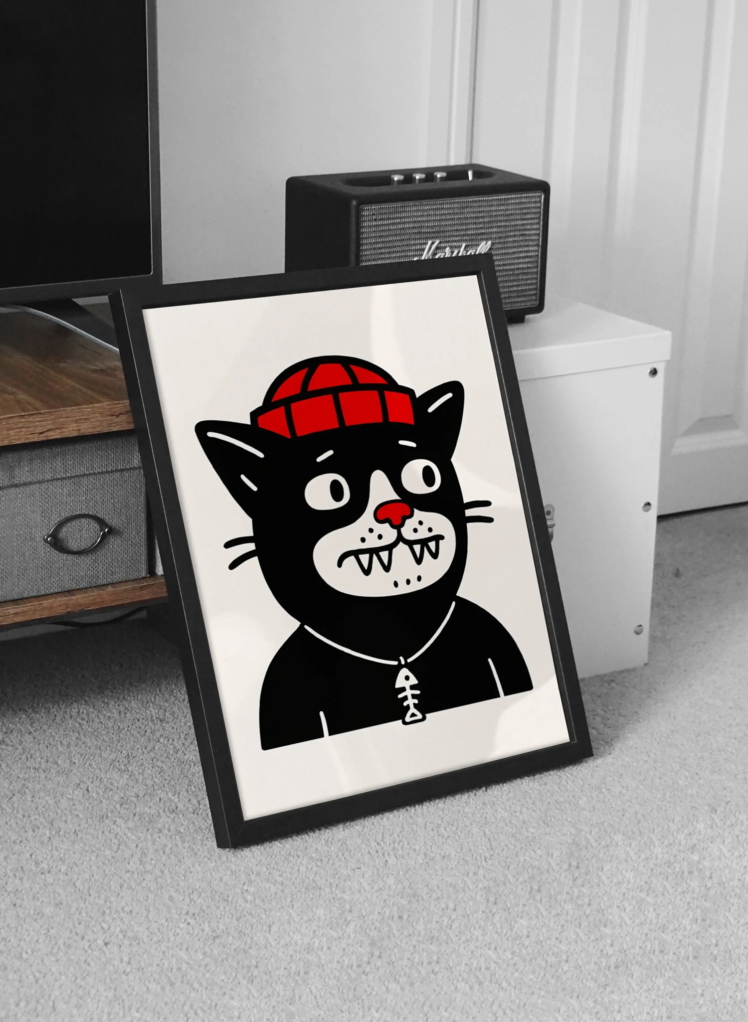 Търсите декорация, която е едновременно забавна и артистична? Нашият арт постер Black Cat е точно това, от което имате нужда. Тази уникална илюстрация представя черна котка с червена шапка (beanie) и медальон под формата на рибена кост, изпълнена в стил, напомнящ класическите олдскуул татуировки. Със своите изразителни очи и зъбки, този постер моментално се превръща в център на вниманието във всяка стая.
