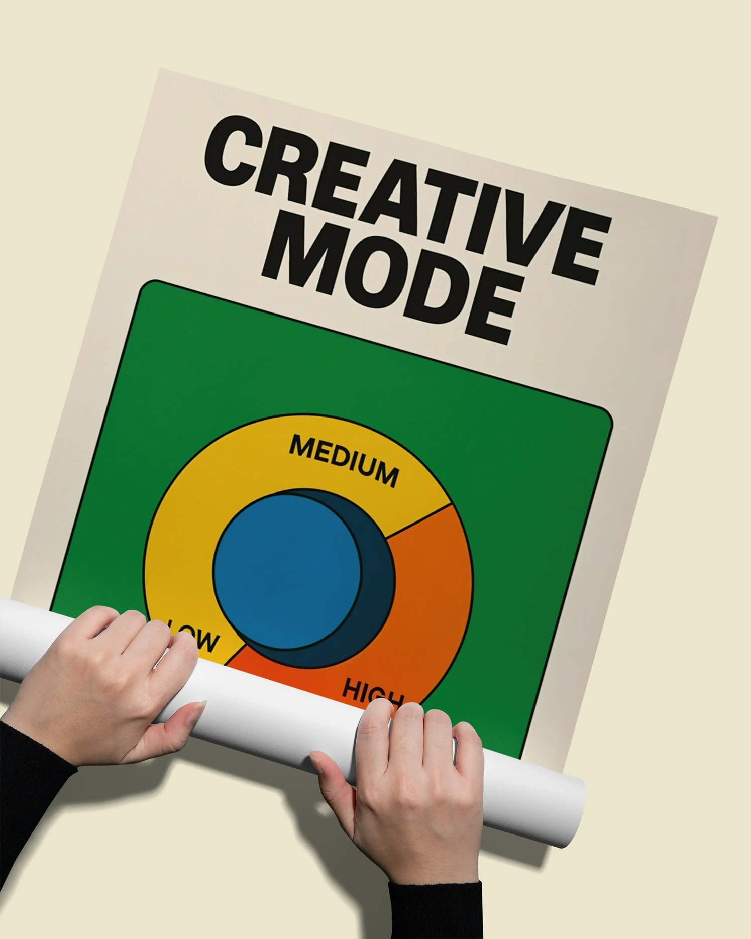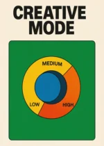 Минималистична типография: Силният, плътен шрифт „CREATIVE MODE“ в горната част придава на постера модерен и графичен вид.