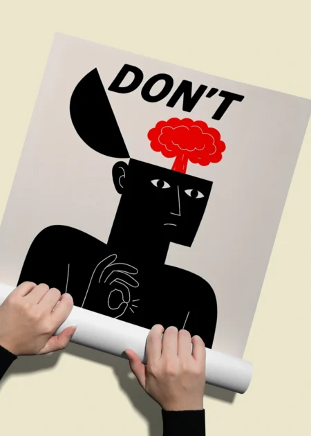 Въздействаща илюстрация: Постерът изобразява голяма червена ръка, около която се е увила черна змия, готова за атака. Тази метафора за риска и отговорността е представена чрез чисти, графични форми, които доминират в композицията.