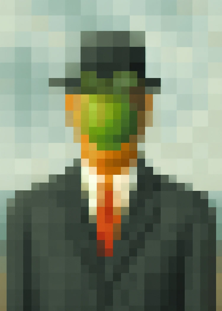 Дигитална деконструкция: Емблематичният образ на мъжа с бомбето и зелената ябълка е пресъздаден чрез цветни пиксели, превръщайки аналоговия шедьовър в дигитална икона.
