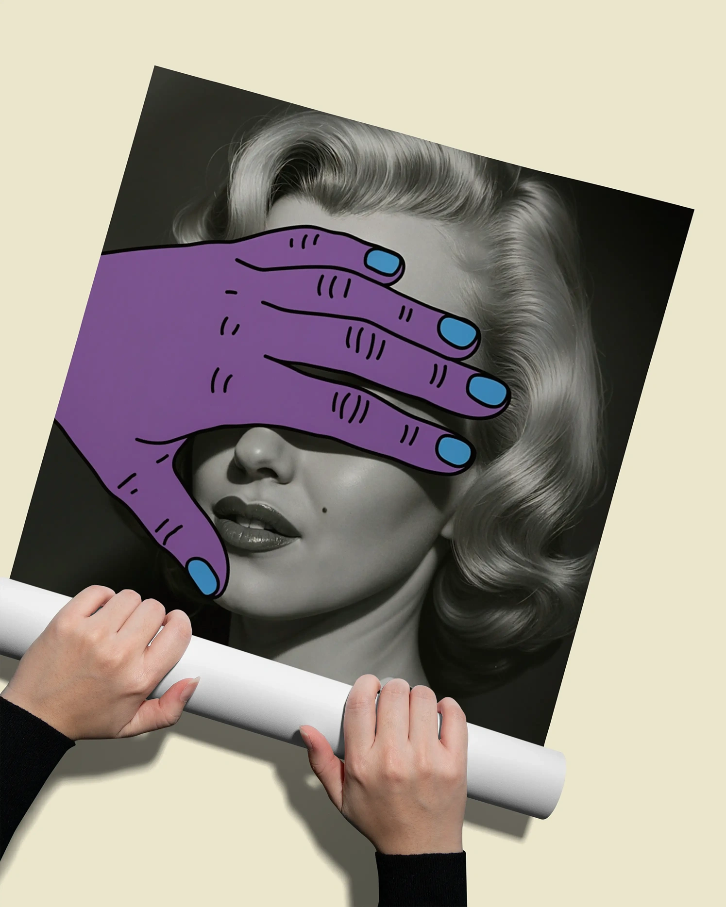 Модерен акцент: Върху класическия образ е добавена стилизирана илюстрация на голяма лилава ръка със сини нокти, която нежно скрива очите на модела.
