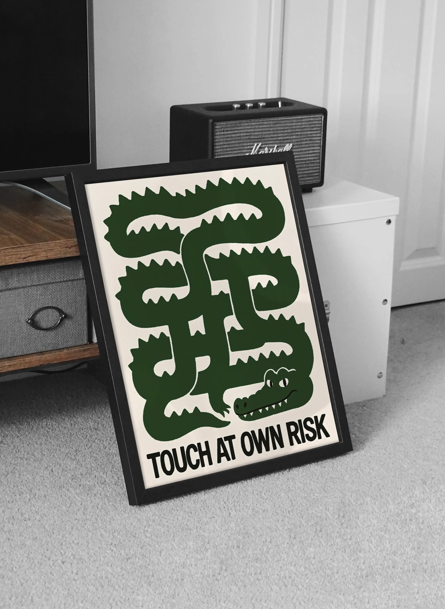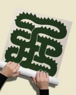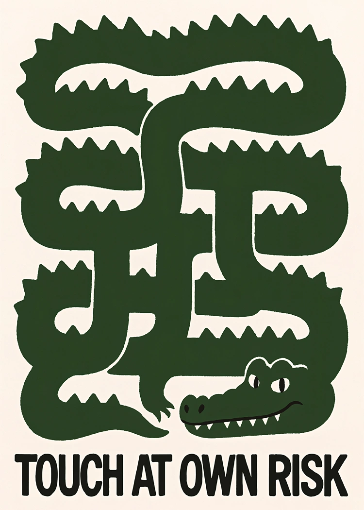Добавете характер и щипка ирония към вашия интериор с нашия арт постер Touch At Own Risk. Този дизайн съчетава графичен минимализъм с игрива визуална главоблъсканица, която веднага привлича погледа. Изображението представя дълго, накъдрено тяло на крокодил, оформено като сложен зелен лабиринт, завършващо с хитра усмивка.