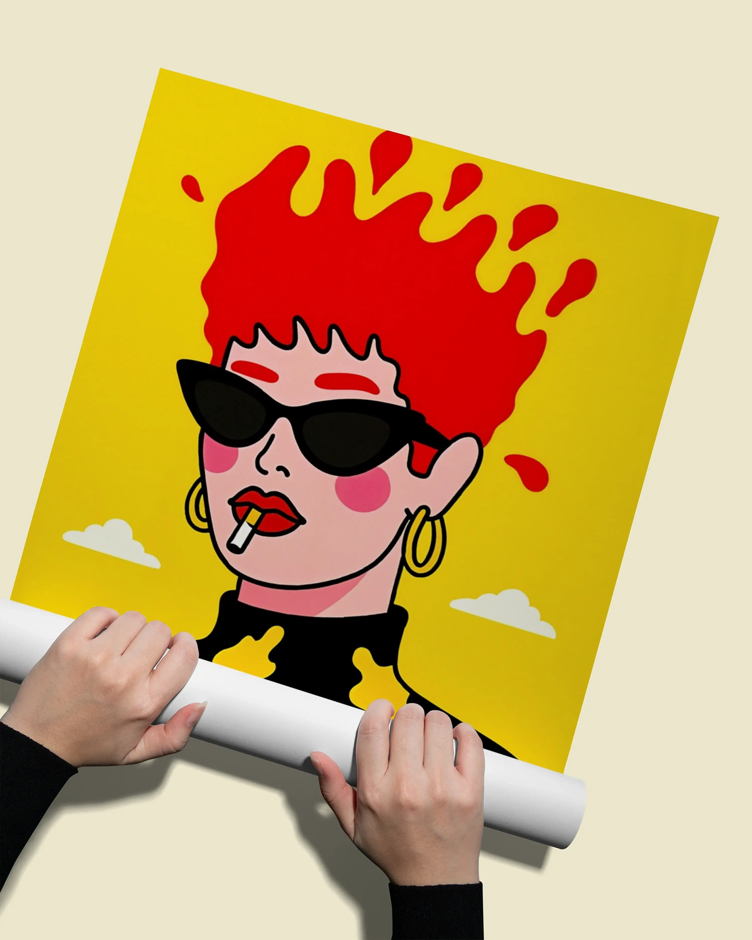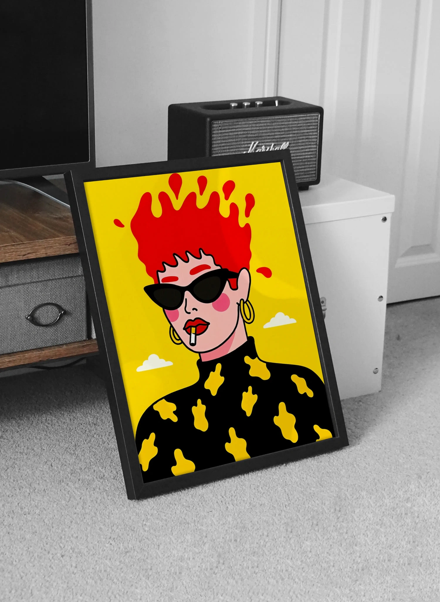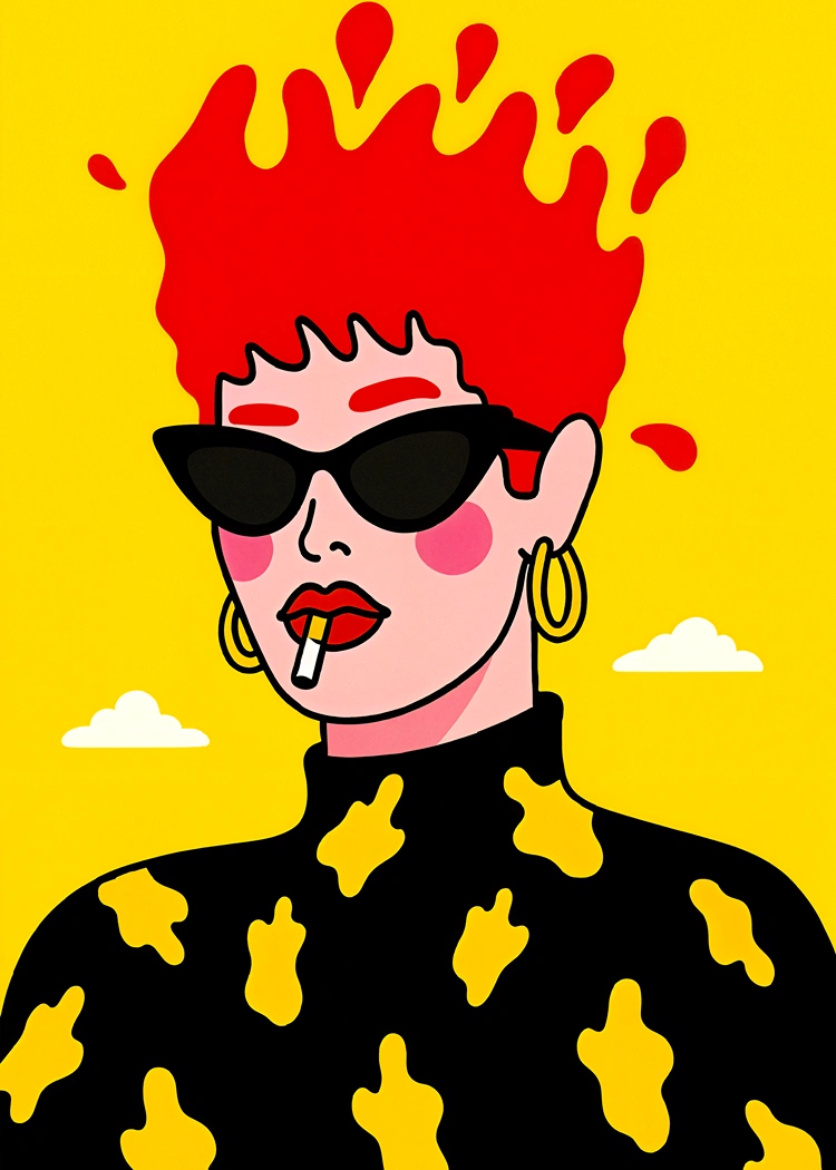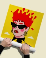 Търсите ли декорация, която не просто запълва мястото на стената, а създава настроение? Нашият поп арт постер Red Hair е точно такъв акцент. Тази модерна илюстрация представя жена със слънчеви очила, чиято яркочервена коса сякаш експлодира върху наситено жълтия фон. Комбинацията от черни очила, златни обеци и пушеща цигара придава на образа едно „cool“ и леко бунтарско излъчване, типично за съвременния поп арт стил.
