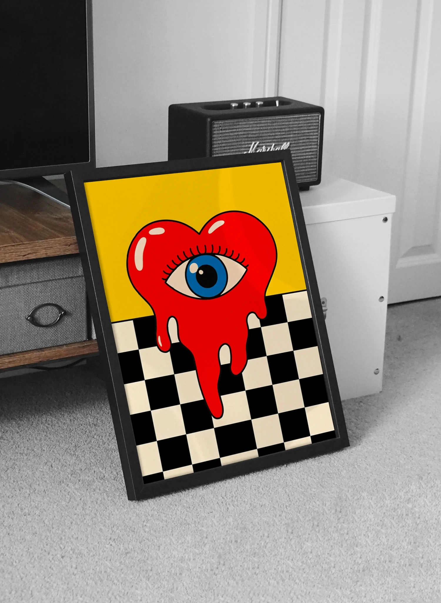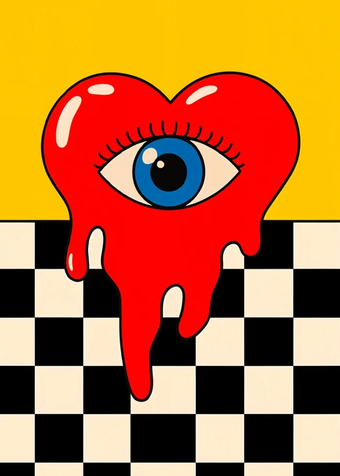 Искате ли стена, която буквално „хипнотизира“? Нашият постер Melting Heart е създаден за тези, които търсят дълбочина и нестандартна визия в декорацията на дома. Тази илюстрация съчетава класическия символ на сърцето с модерен сюрреалистичен прочит – разтичащи се форми, централно разположено око и контрастен черно-бял кариран фон. Жълтият акцент в горната част добавя необходимата доза слънчева енергия, за да балансира дръзката композиция.