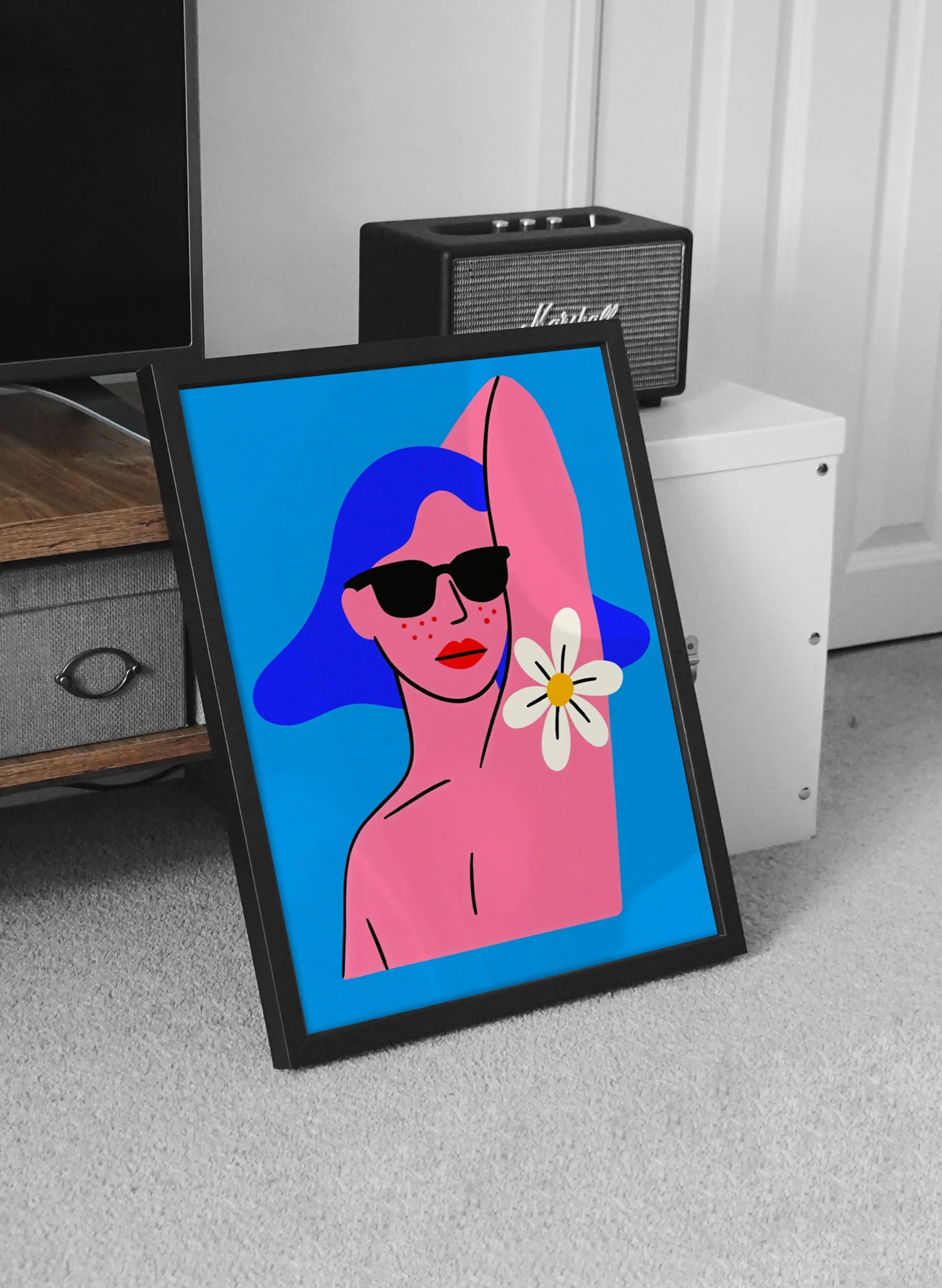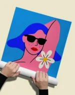 Защо да изберете този дизайн? Дизайнът на този арт постер е вдъхновен от поп-арт културата и модерната естетика. Контрастът между наситеното синьо и розовите нюанси придава дълбочина на изображението, докато маргаритката и слънчевите очила символизират безгрижието на летните дни. Той е идеален за акцент в хола, спалнята или дори във вашето работно пространство, където ще вдъхновява креативността ви всеки ден.