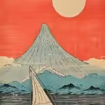 Илюстрация на море, лодка и червено небе