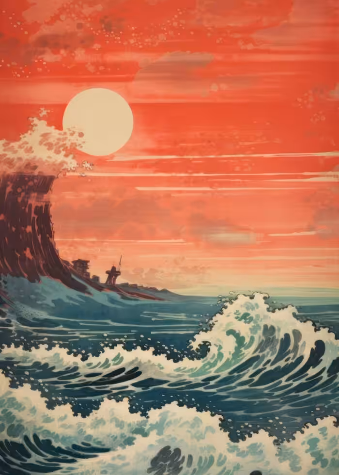 Илюстрация на бурно море и червено небе