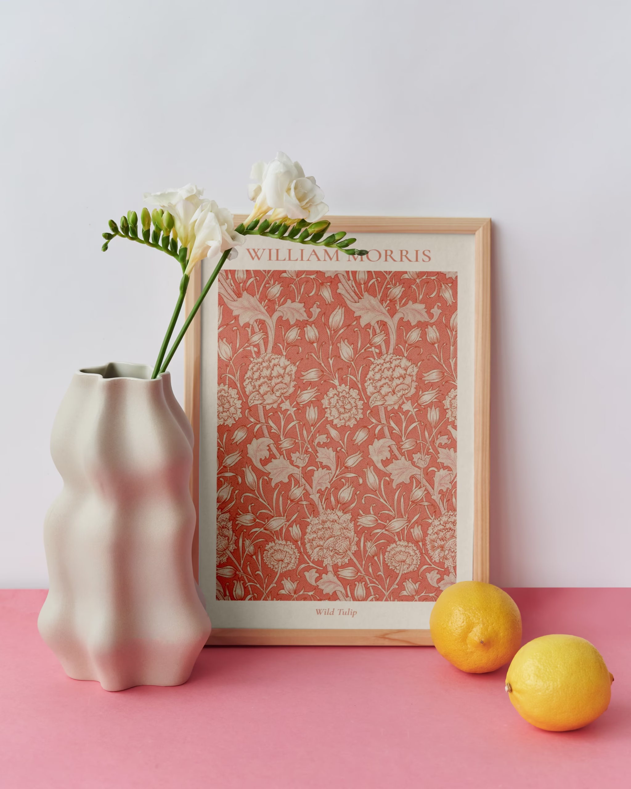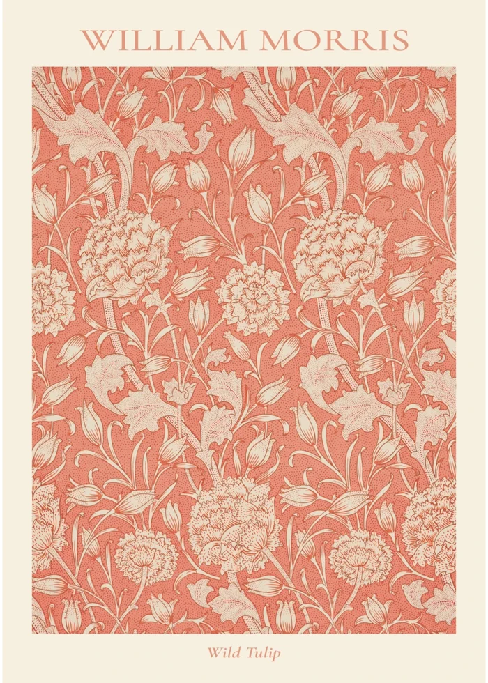 William Morris Wild Tulip е един от най-живописните декоративни мотиви на легендарния дизайнер Уилям Морис – икона на движението Arts & Crafts. Дизайнът съчетава деликатни, стилизирани лалета с органични листа и извивки, създавайки усещане за природна грация, елегантност и вечна хармония.